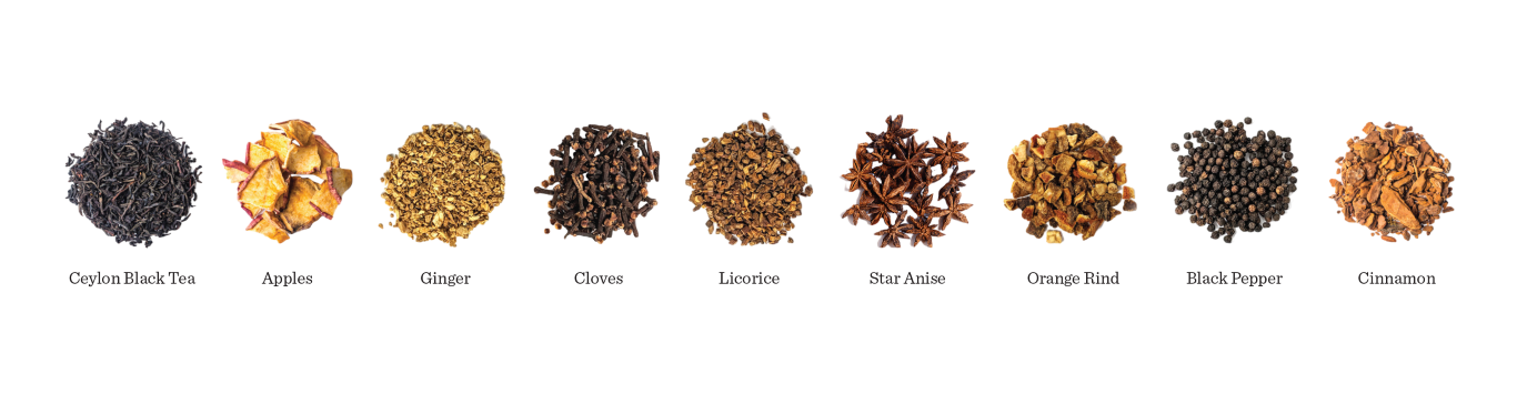 Ceylon Black Tea, Apples, Ginger, Cloves, Licorice, Star Anise, Orange Rind, Black Pepper, and Cinnamon