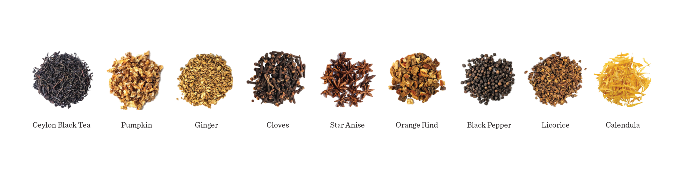 Ceylon Black Tea, Pumpkin, Ginger, Cloves, Star Anise, Cinnamon, Orange Rind, Black Pepper, Licorice, Calendula, and Organic Natural Flavor
