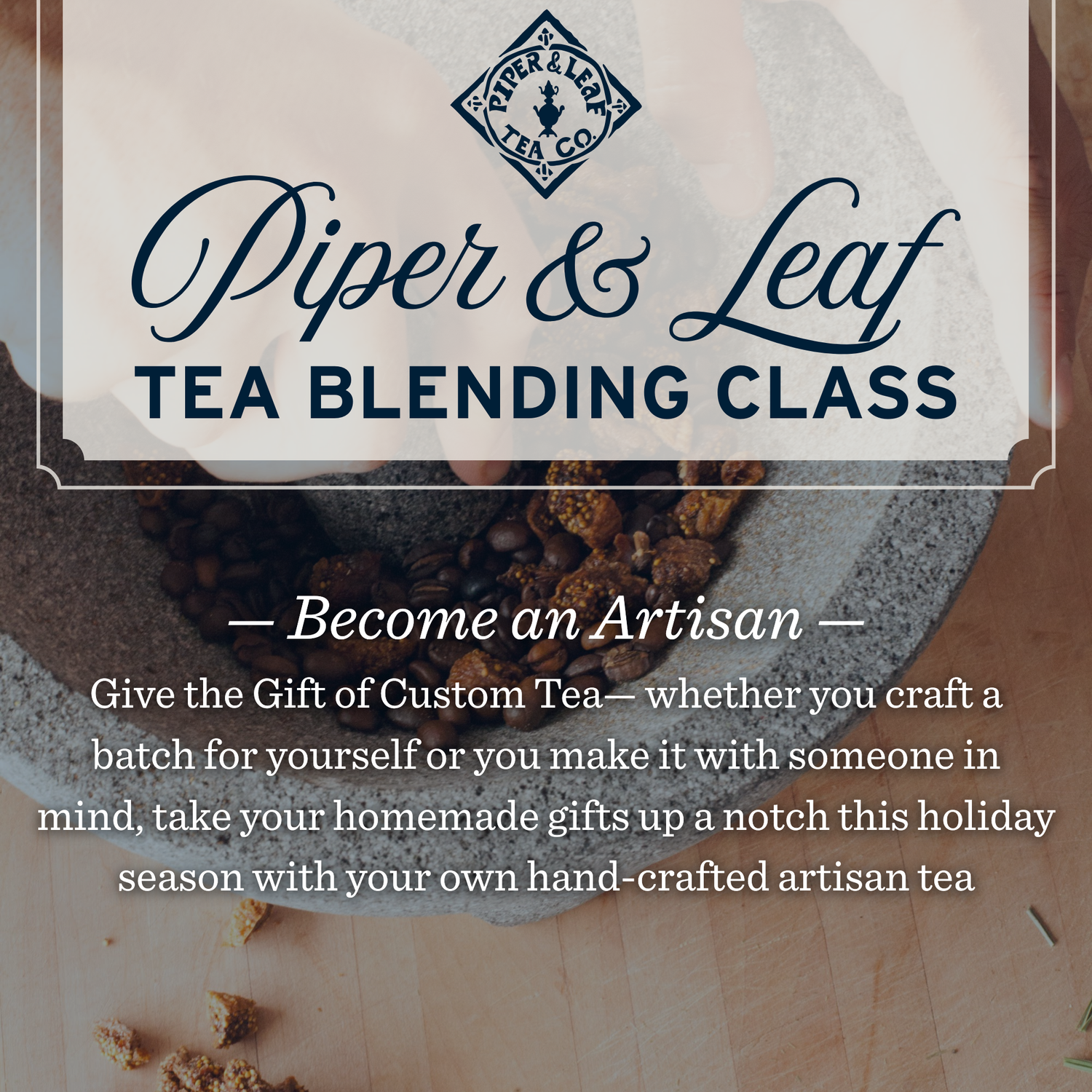 Join us for a festive, hands-on Tea Blending Workshop where you become the artisan! Craft your own one-of-a-kind tea blend with guidance from our team while enjoying delicious tea.