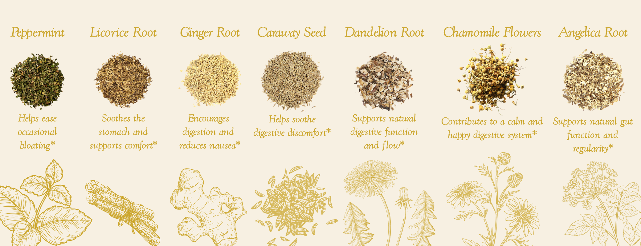 peppermint leaf, licorice root, ginger root, caraway seed, dandelion root, chamomile flowers, and angelica root