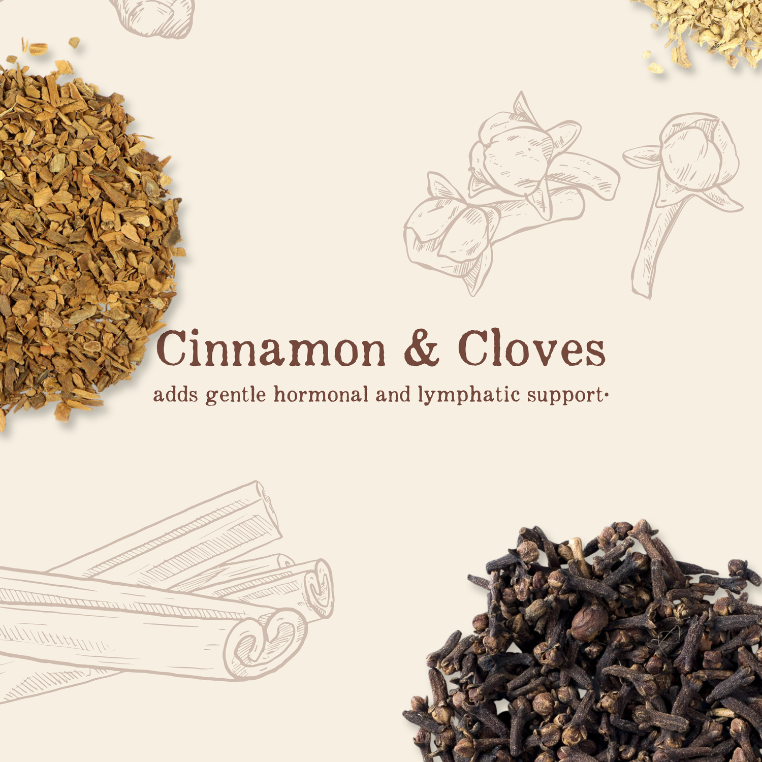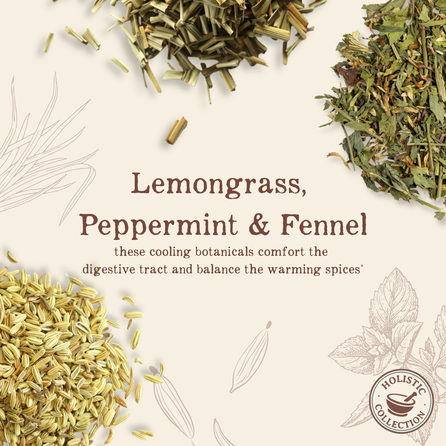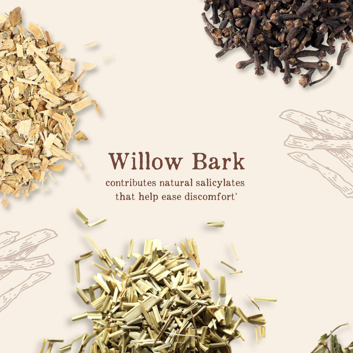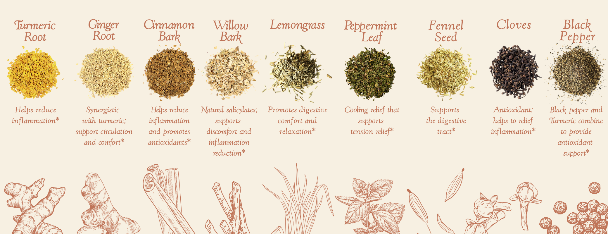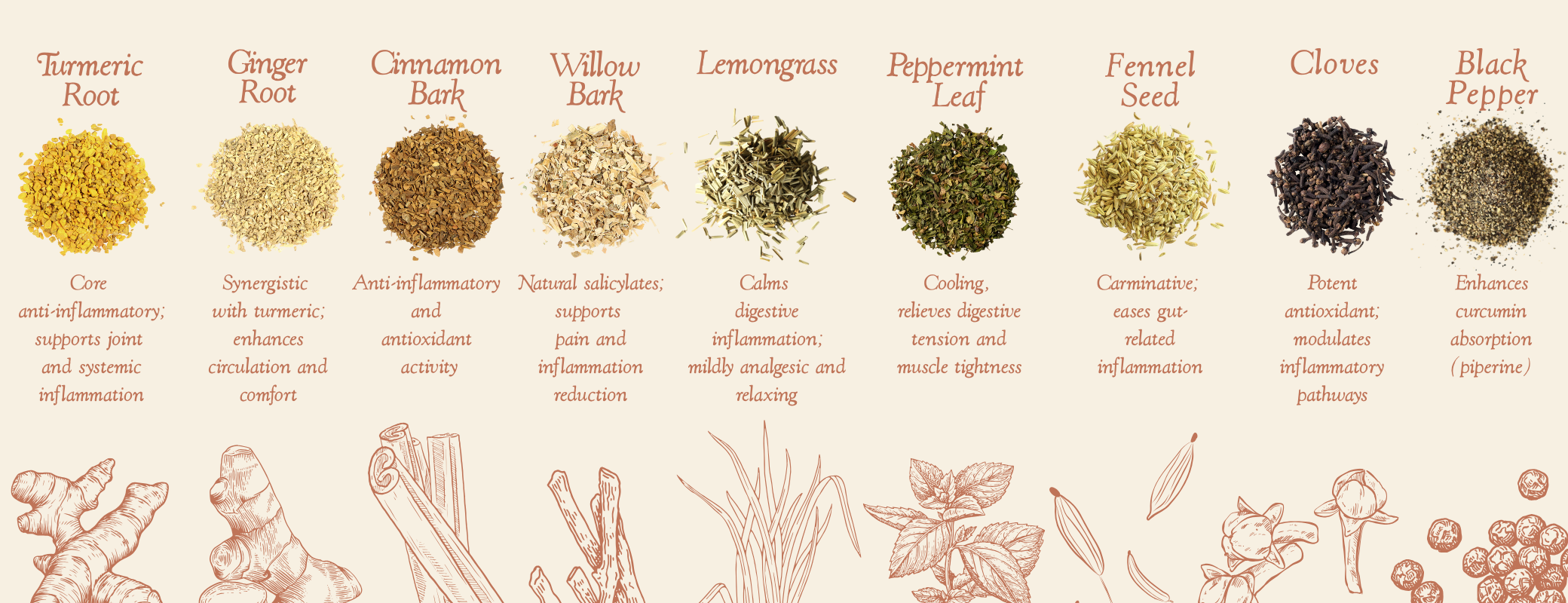 tumeric root, ginger root, cinnamon bark, willow bark, lemongrass, peppermint leaf, fennel seed, cloves, and black pepper