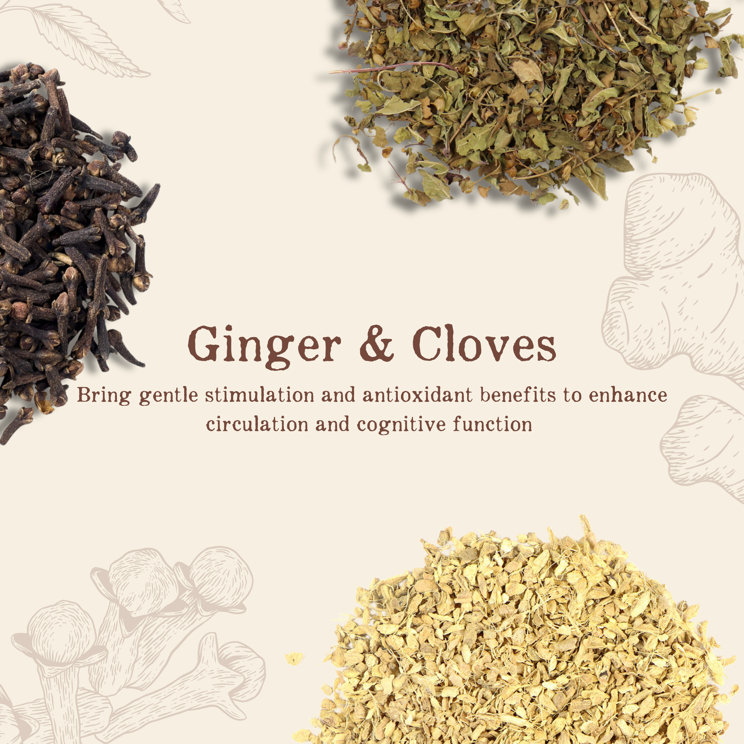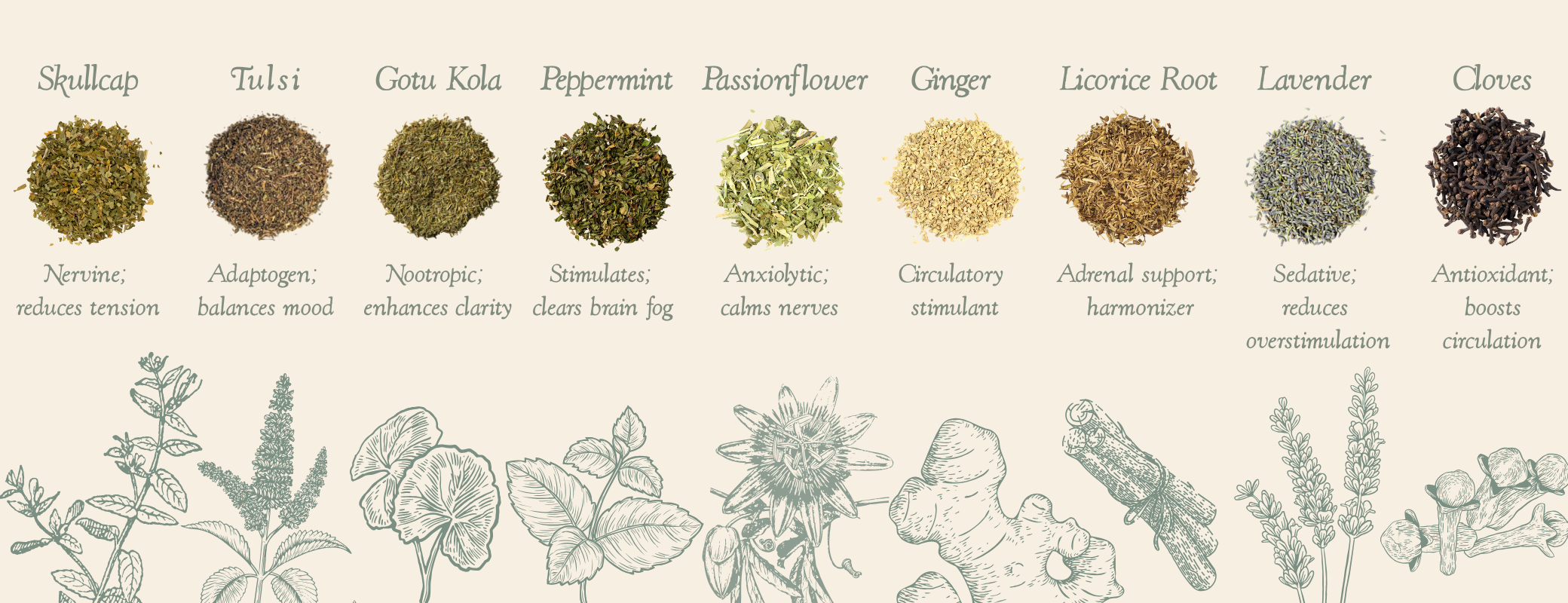 skullcap, sulsi, gotu kola, peppermint, passionflower, ginger, licorice root, lavender, and cloves