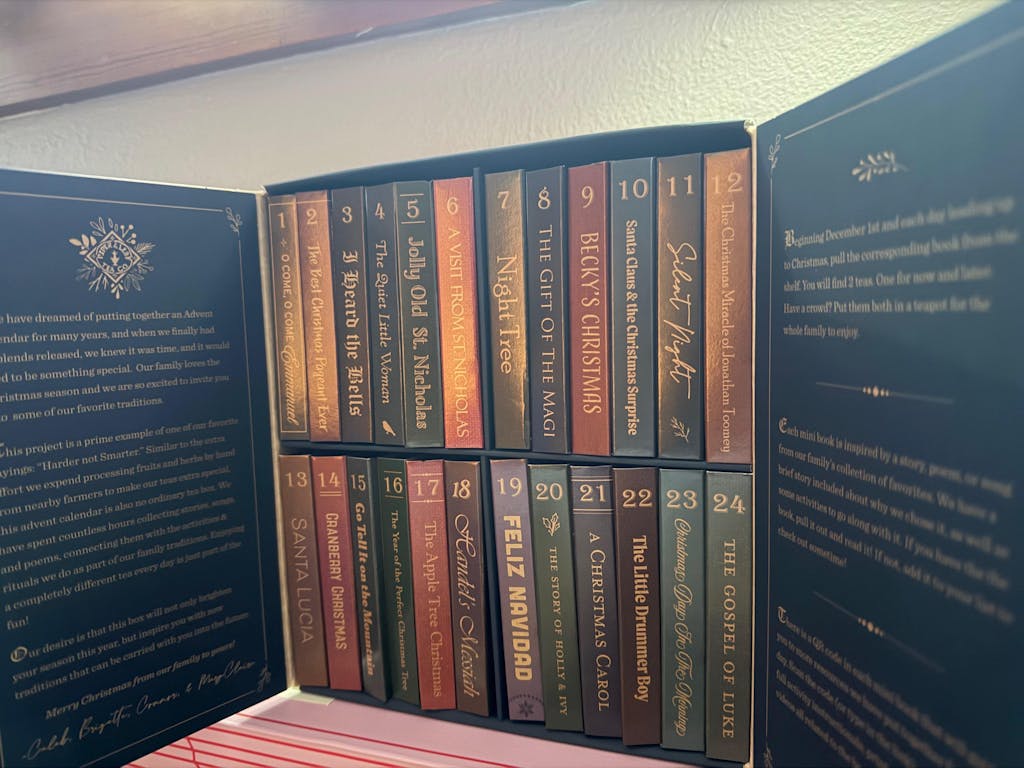 Tea is just the beginning of this advent experience! Each day, you pull a "book" off the shelf, inspired by a specific story or song from our collection of favorites. Inside you will find 2 tea bags of a delicious blend, along with a story, activity, and QR code to dive deeper with more activities, recipes, and thoughts for the day.