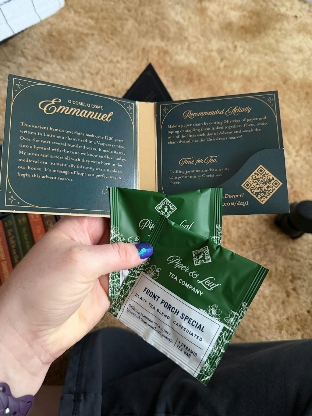 I love the bookshelf style of it and how thoughtful each day is put together with two tea bags for you to try or share! There is a huge variety, including seasonal flavors, with no repeats and gives you the perfect opportunity to try a little bit of everything— which I like, as I generally don't go out of my way to try very many different teas. I especially love the little readings (if you're religious) you can do or crafts, which can make it fun if you have small children.