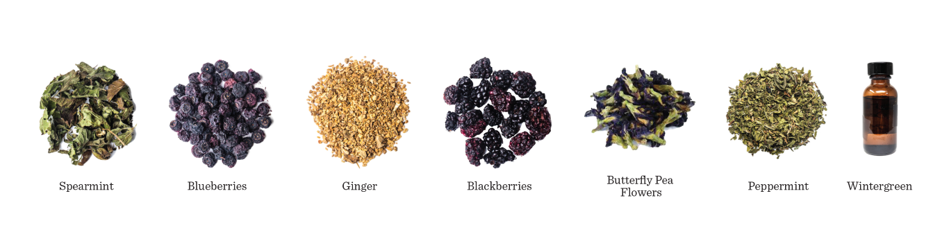 Spearmint, Blueberries, Ginger, Blackberries, Butterfly Pea Flowers, and Peppermint