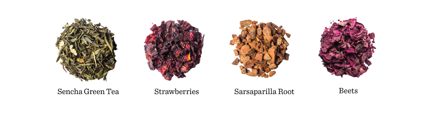 Sencha Green Tea, Strawberries, Sarsaparilla Root, Natural Flavor, and Red Beets (for color)