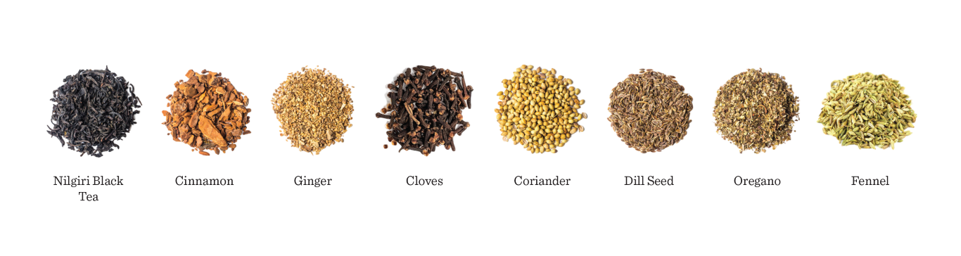 Ingredients: Nilgiri Black Tea, Cinnamon, Ginger, Cloves, Coriander, Dill Seed, Organic Flavor, Oregano, Fennel