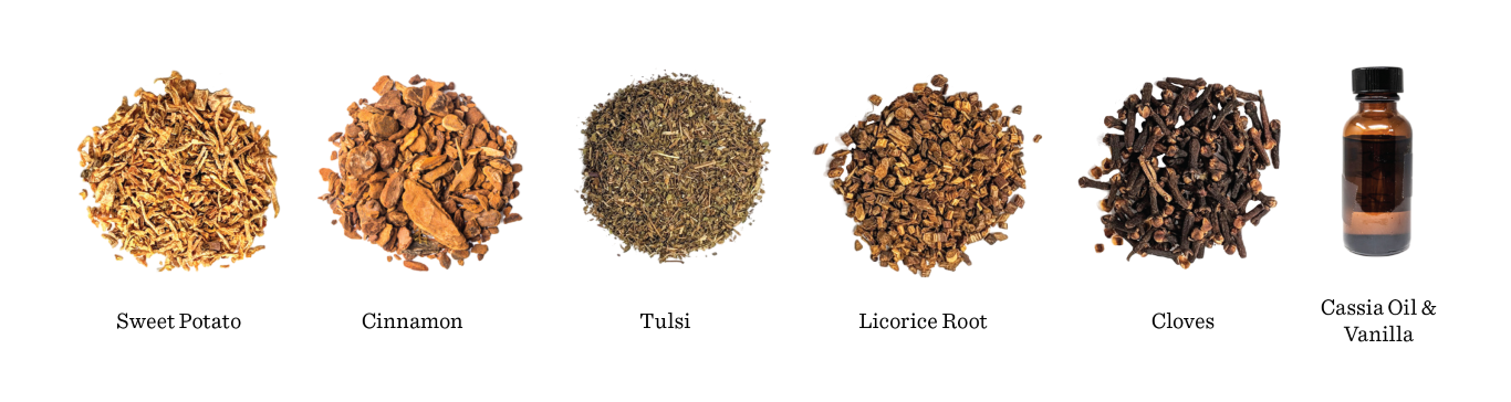 Sweet Potato, Cinnamon, Tulsi, Ginger, Licorice Root, Clove, Organic Flavor, and Cassia Oil