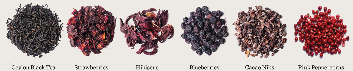 Ceylon Black Tea, Cacao Nibs, Hibiscus, Strawberries, Raisins, Elderberries, Figs, Chocolate (dairy free), Raspberries, Pink Peppercorns, Blueberries, and Organic Flavor